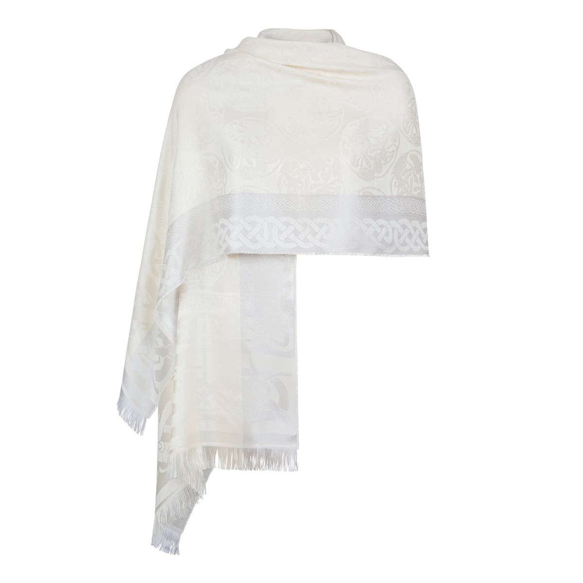 Celtic Motif Stole by Jimmy Hourihan is a graceful piece woven with a timeless cream and white Celtic spiral motif, symbolizing the heritage and artistry of ancient Ireland. Crafted from 100% micro acrylic, it has a soft, silky feel that is smooth to the touch and drapes beautifully. The intricate design is achieved using special Jacquard looms, making it a standout accessory for both elegance and comfort. Ideal for special occasions, this stole embodies the refined craftsmanship of Dublin’s renowned fashion designer, Jimmy Hourihan.