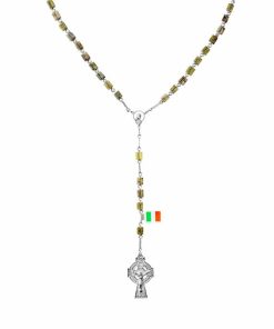 Handcrafted in Ireland, these Connemara Marble Rosary Beads are a timeless expression of faith and artistry. Each unique cubed marble bead showcases the varied greens of Connemara Marble, a natural stone found only in the western mountains of County Galway and protected by Irish law since 1922. The rosary features a Celtic crucifix and is strung on an extra-strong double-link chain, measuring 25″ in length. Rooted in centuries of Irish tradition, these beads carry a sense of serenity and devotion, continuing a legacy that began with monks crafting Ireland’s first rosaries from natural materials.