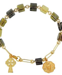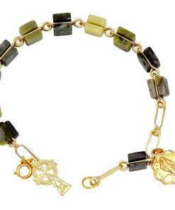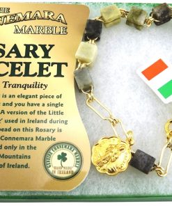 The Connemara Square Gold Plated Rosary Bracelet beautifully combines faith and Irish heritage. Worn on the wrist, it serves as an elegant piece of jewelry, and when unfastened, it transforms into a single decade of the Rosary – a version of the traditional Paidrin Beag or “Little Rosary,” once used in Ireland during the Penal days. Each bead is handcrafted from genuine Connemara Marble, found only in the mountains of Connemara in the west of Ireland, making every bracelet truly unique and deeply meaningful.