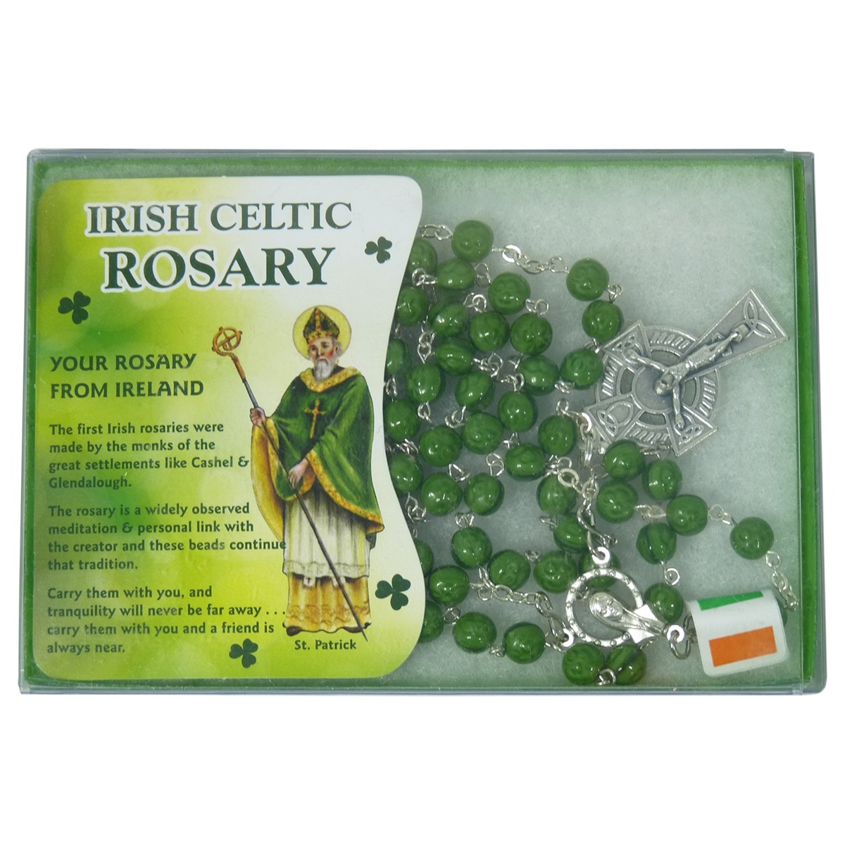 This beautiful Green Shamrock Rosary features round green beads, each adorned with a subtle shamrock design symbolizing Irish heritage. The centerpiece showcases a delicate Virgin Mary, while the back of the Celtic Cross is engraved with the word “Erin.” Presented in a stylish box, this rosary makes a cherished Irish memento and is an ideal gift for First Communion, Easter, and many other special occasions. Made in Ireland.