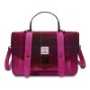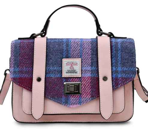 Medium satchel crafted with authentic Harris Tweed in a pink and blue tartan design. Perfect size for everyday essentials with comfortable all-day wear.