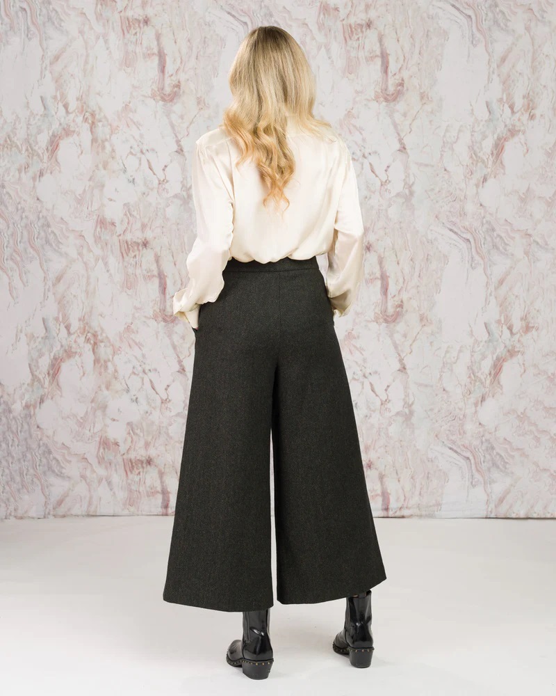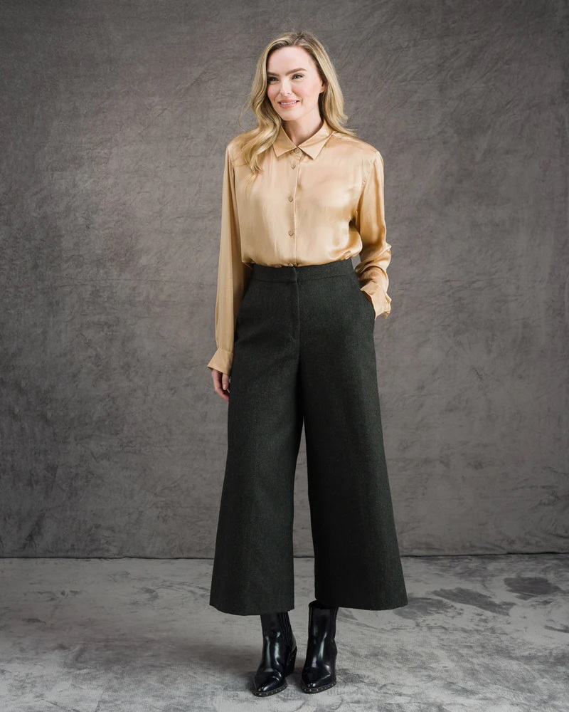High-waisted 100% wool tweed culottes in classic green herringbone. Elegant wide-leg fit for smart or casual styling.