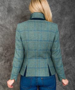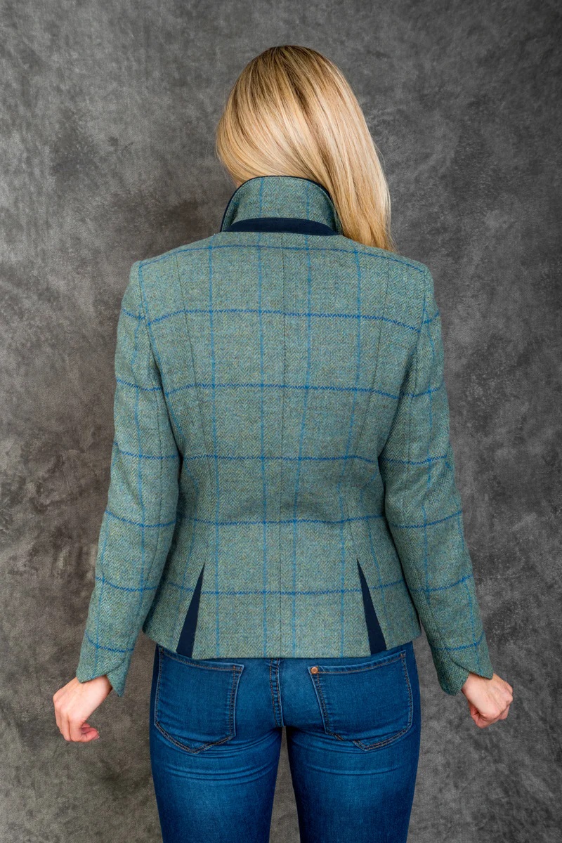 100% Yorkshire-woven wool tweed jacket in light teal check. Elegant, structured and designed for timeless seasonal wear.