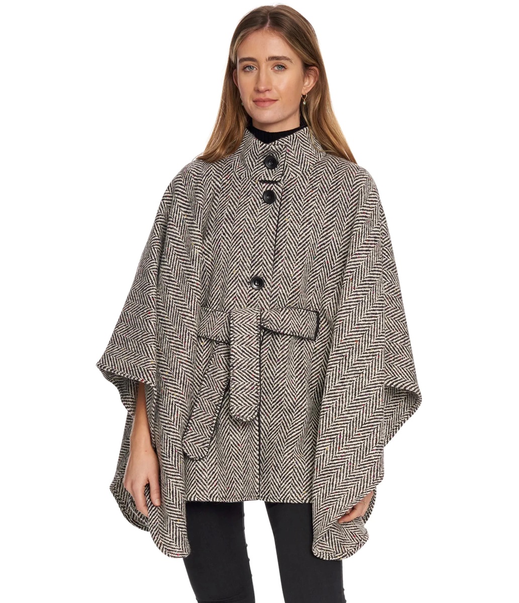 Jimmy Hourihan Cape in Herringbone Tweed with Belt, Black/White