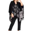 This Jimmy Hourihan Fringed Shawl with Triskele Motif is the perfect addition to your Irish wardrobe, this cape creates a statement while keeping you cosy and warm. This shawl is made in 100% Acrylic velour with Chenille Yarn Triskele Motif. The motif effect is achieved by weaving on special Jacquard looms.
