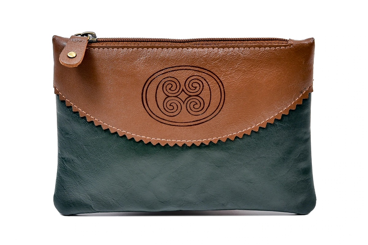 Style and handiness all in one. This top zippered compartment purse is perfect for keeping small essentials or cash, cards and coins safely tucked away. Featuring a Celtic spiral motif on luxurious leather in tan and green. Simple design resulting in an easy to use leather pouch for quick and daily service.